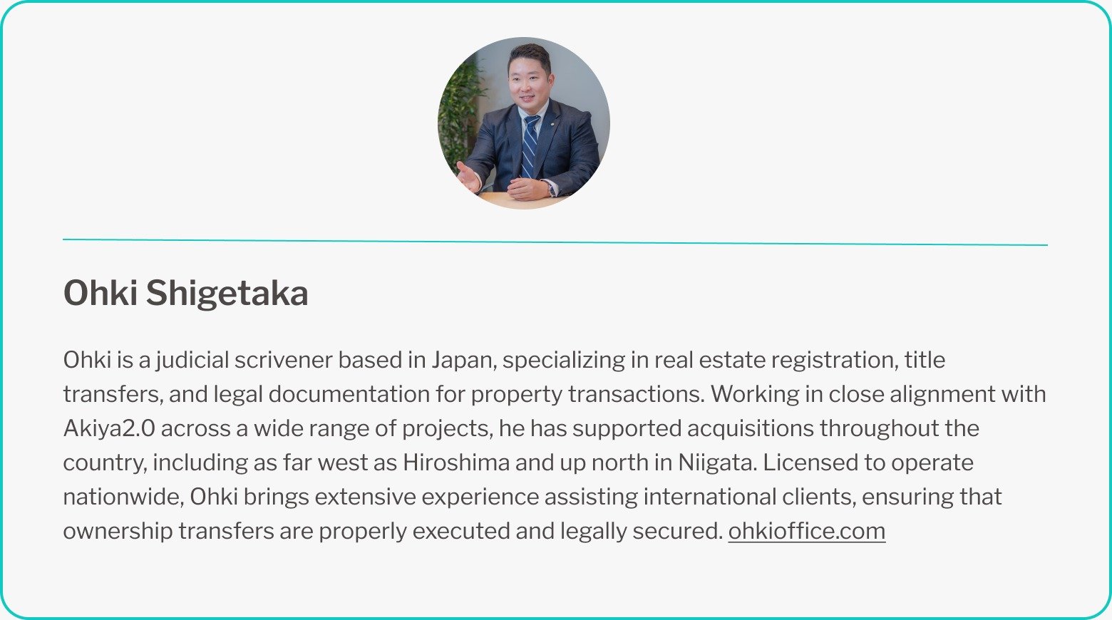 Buying property can feel like a daunting and overwhelming ordeal without the right guidance. Speaking with Ohki offered a rare, candid look into the legal side of property ownership in Japan, as his insights on navigating document complexities, understanding the legal procedures, and common misconceptions remind us that due diligence is essential. With the right professionals in your corner, what looks like a complicated marathon becomes a manageable and even exciting process. At AKIYA2.0, working alongside trusted specialists like Ohki is central to how we support our clients, not just in finding the right property, but also in making sure the path to ownership is clear, legal, and stress-free.